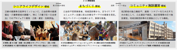 の3つに分かれており、今回は主に①シニアライフデザイン領域と②まちづくり領域に従事するスタッフを募集いたします。