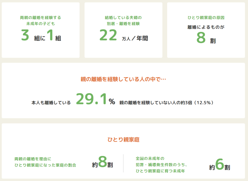 また、日本のひとり親家庭の約8割が離婚によるものです。