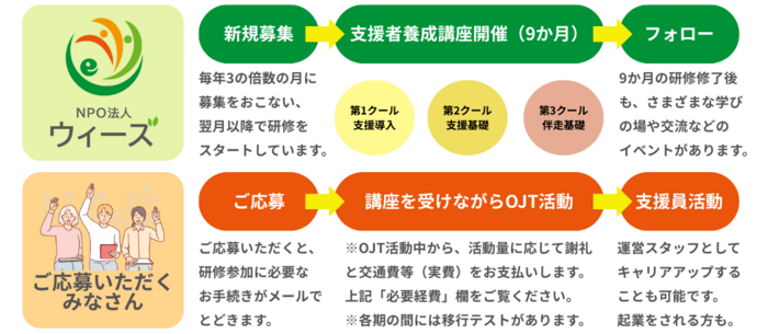 ウィーズ支援員の多くが、自身もこども時代に家庭環境に悩んだ当事者であり、そのしんどさを負のものとして引きずらないようにし、癒しに至るプロセスを体系化した、この「支援者養成講座」を受けることで、こどもの視点に立ち、適切な関わりを第三者として持てるよう意識しながら活動しています。