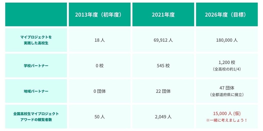 現在進行系で進む戦後最大の教育改革の中でも探究学習は重視されており、学校や行政の関心は年々高まっています。2021年には、過去最大となる69,912人の高校生がマイプロジェクトを実践。今後、更に事業をドライブし、2026年までに「18万人の高校生がマイプロジェクトを実践できる環境」づくりを目指しています(下記、5か年計画と長期目標)。