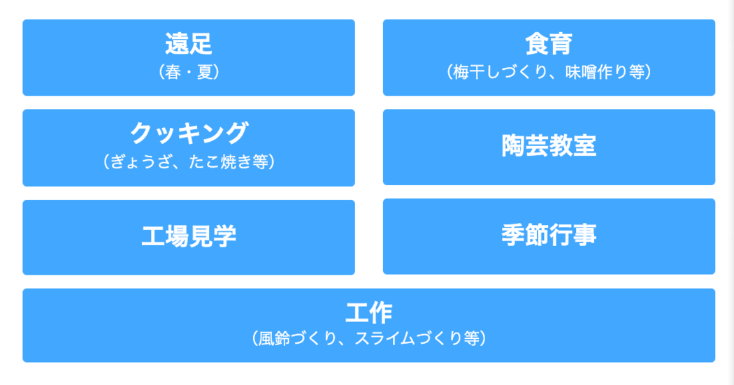 子どもたちの「遊び」「体験」を創る学童です!学校がある日は学校へお迎えに行き、宿題をし、公園へ遊びに行きます!夏休みなど長期休みは普段できない活動をします!あなたの創意工夫、遊び心をお待ちしています!