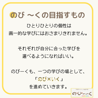 「のびのび生きる」ということ子どもたちが、「自分らしく」のびのびと生きていけるような社会は、すべての人にとって、生きやすい社会になるのではないかと考えます。そのような社会に向けて、「のびーく」は、自分の人生をつくる学びのび×いくを広げていきます。