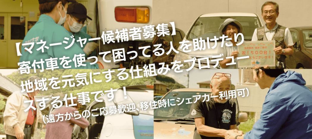 今回の募集は「寄付車を使って人と地域を元気にする事業(ソーシャル・カーサポート事業)」での業務を担っていただける方、そして、マネージャーを目指して向上心を持って取り組んでいただける方を募集します。