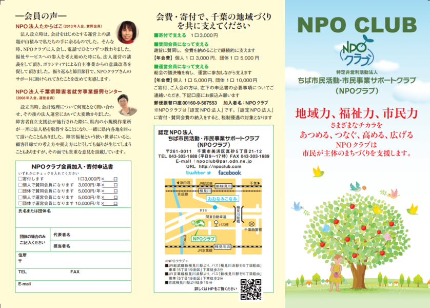 特定非営利活動法人ちば市民活動・市民事業サポートクラブ(NPOクラブ)では、様々な分野の地域づくりのコーディネートを行い住みやすい地域をつくっていくため新しい人材を求めています。ご応募をお待ち致します。