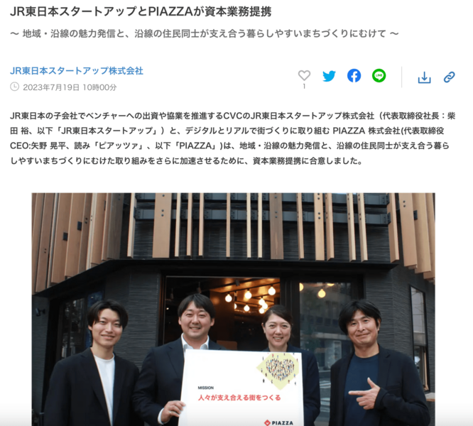 “人々が支え合える街をつくる”というミッションのもと、地域コミュニティアプリ「ピアッザ」の開発・運営や地域共創スペース「ピアッザ」を企画・運営し、地域の住民同士やそこで働くひとたちをつなぎ、リアルとデジタルを掛け合わせたまちづくりに取り組む。グローバルで進む都市化とともに、希薄化する地域内でのコミュニケーション、その受け皿となる地域コミュニティの減少を起因とした地域社会の課題解決を目指す。
