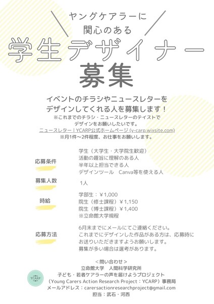 この募集の受入団体「立命館大学 子ども・若者ケアラーの声を届けようプロジェクト(YCARP)」をフォローして、