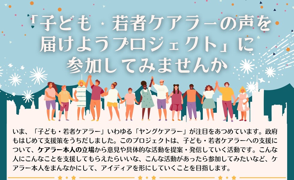 いま、「子ども・若者ケアラー」いわゆる「ヤングケアラー」が注目をあつめています。政府もはじめて支援策をうちだしました。このプロジェクトは、子ども・若者ケアラーへの支援について、ケアラー本人の立場から意見や具体的な活動を提案・発信していく活動です。こんな人にこんなことを支援してもらえたらいいな、こんな活動があったら参加してみたいなど、ケアラー本人をまんなかにして、アイディアを形にしていくことを目指します。