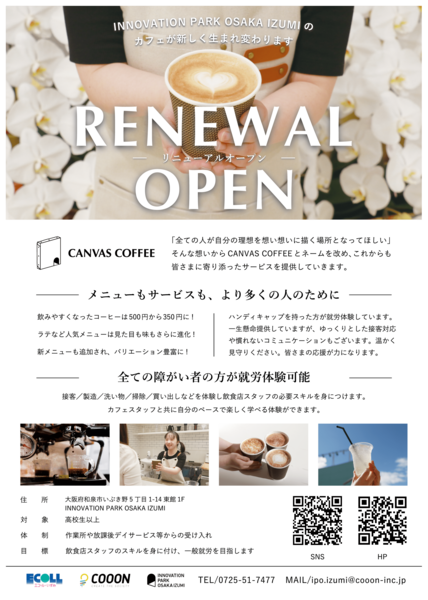 大阪府和泉市のINNOVATION PARK OSAKA IZUMIに併設されているカフェ"CANVAS COFFEE"でアルバイト/パート募集!