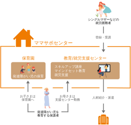 発達障がいのあるお子さま一人一人の、学習面・行動面・社会性・コミュニケーションなどにおける課題に対し、行政や支援機関と連携してサポートを行う保育施設、お子さまを養育されている保護者の就労支援を同時に行う事業所です。ママサポセンターでは、就労困難者やシングルマザー等を対象に、ITスキルをメインとしたオンライン教育を行い、現代に求められるIT人材を輩出する教育就労支援事業を行います。2022年2月に東京都ソーシャルファーム予備認証を取得多様な人が働ける環境を提供すると共に、シングルマザーや経済的な困難を抱える女性たちのIT教育と就労支援を行うことで、社会課題の解決を目指します。