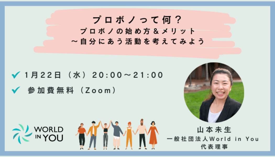 プロボノやボランティアの活動内容や参加する意義、知っておくべきことなど、20年以上ビジネスとソーシャルの橋渡しをしてきた山本未生(World in You代表)がお話したり、質問にお答えします。