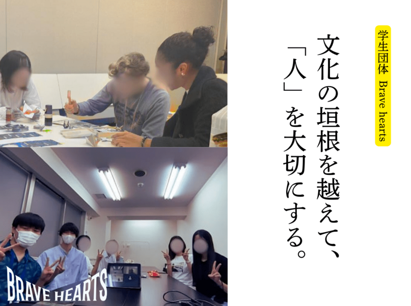 Brave heartsは、「国際交流イベント」や「啓発活動」などを通じて様々な国籍の方が「人」として尊重される多文化共生社会の実現を目指す団体です。