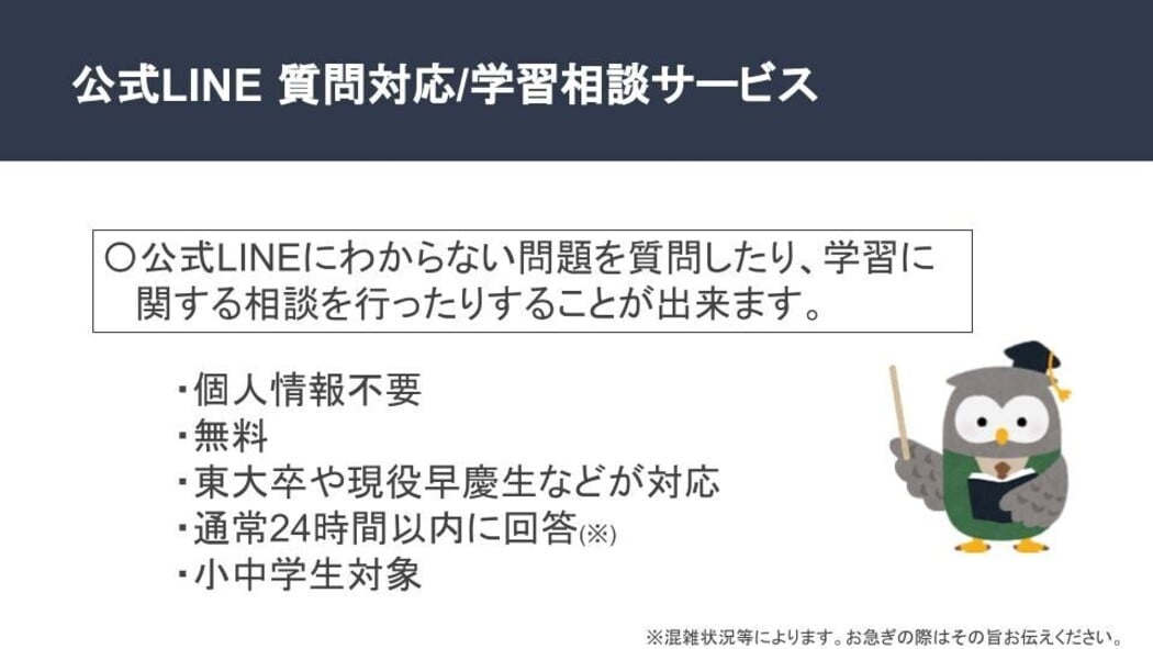 | 新型コロナウイルスの影響の長期化により自宅学習が増加したことを受けて、いつでも弊法人のLINE公式アカウントに質問や学習相談を行えるシステムを用意しました。機会格差是正の目的も兼ねるため、新型コロナウイルスの流行終息後も運用を継続します。 |