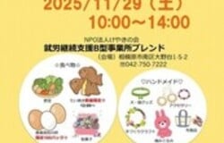 新着国内/単発ボランティア 【一日体験】手作りマルシェ開催に力を貸してください!当日ボランティア大募集!!! 特定非営利活動法人けやきの会 古淵駅 徒歩22分 [相模原市南区大野台] (古淵駅から徒歩22分自転車置き場あり) 無料 2025年11月29日(土) 初回公開日:2025年10月31日 最終公開日:2025年10月31日 更新日:2025年11月04日 活動曜日:土日祝 第7回「秋の手づくりマルシェ」を開催します!障害者施設や一般作家さんの手作り品、農業高校の卵、お菓子、キーマカレーなどの販売をします。地域の人が集うイベントを一緒に盛り上げて楽しい時間を作りましょう!