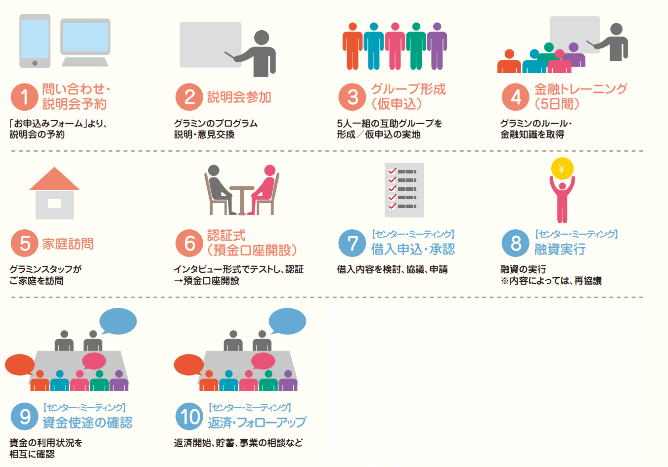 グラミン日本はこれまでの金融ではカバーされなかった人たち、たとえば働く意欲はあっても今は生活が苦しいシングルマザーやワーキングプアの人たちに、生活資金ではなく、自立のための少額の融資と就労・支援をワンストップで提供します。借り手が5人一組となって互助グループを作り、起業や就労の準備のための融資を受けます。