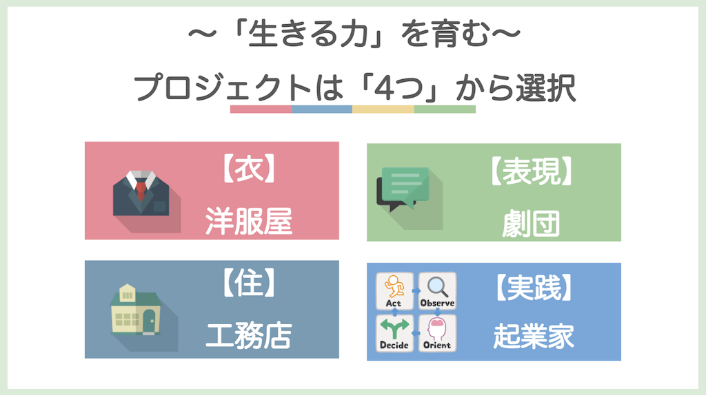 キンダリーインターナショナルでは年間を通じて、4つのプロジェクトが活動をしています。洋服屋は服飾で自分を表現する、劇団は演劇により自分を表現する、工務店はものづくりで自分を表現する、そして最後に起業家はアントレプレナーシップ教育(3年生以上)となります。