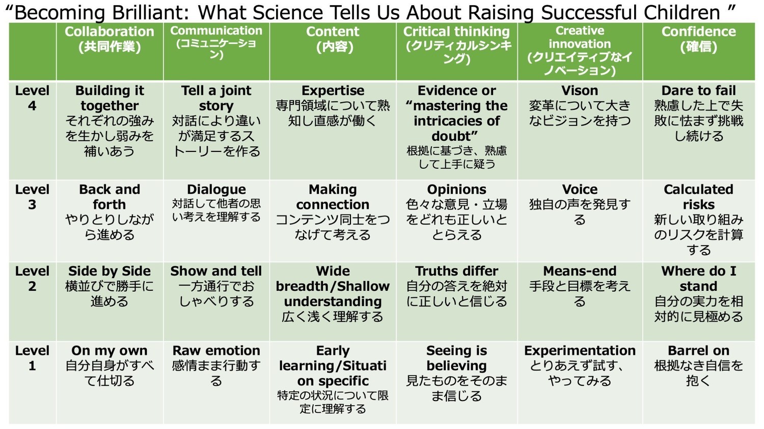 この活動の目的はプロジェクトゴールに向けた活動し、人生100年時代を生きていくためのスキルセットを獲得するコトを狙っています。コラボレーションスキル、コミュニケーションスキル、コンフィデンスなどなど、それぞれのスキルがどのレベルにあるかを把握しておく事は子供も大人も自分を知ると言う点においてとても重要な視点になります。