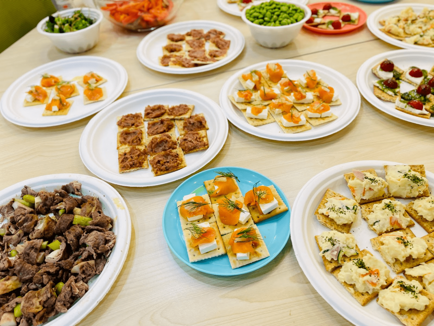 ※ビーンズ名物「クラッカーの上にいろいろのせ」。みんなで作るから美味しい!