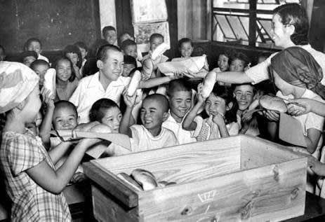 大量に送られた小麦粉や脱脂粉乳のおかげで、やせ細っていた子供たちは成長に必要な栄養を補給することができました。現在65歳以上の方々の多くは、その恩恵を受けていたのです。そして、彼らは、教育を受け、日本の高度成長を支える人材に育ちました。