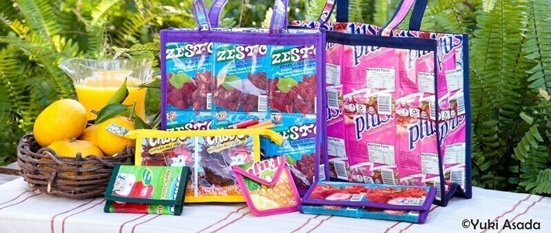 ゴミ処理場からジュースパックなどを回収し、バッグや小物を製作。ゴミのリサイクルにつながる上、それまでゴミ回収で生計をたてていた方々の衛生的で安定した収入源に!