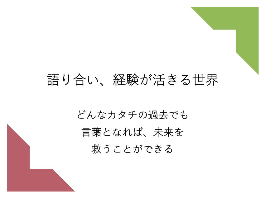 その人にしか話せない当時の音・言葉・匂い、独特の雰囲気、経験者それぞれが持つ唯一のエピソードこそ聞き手に響くもの。