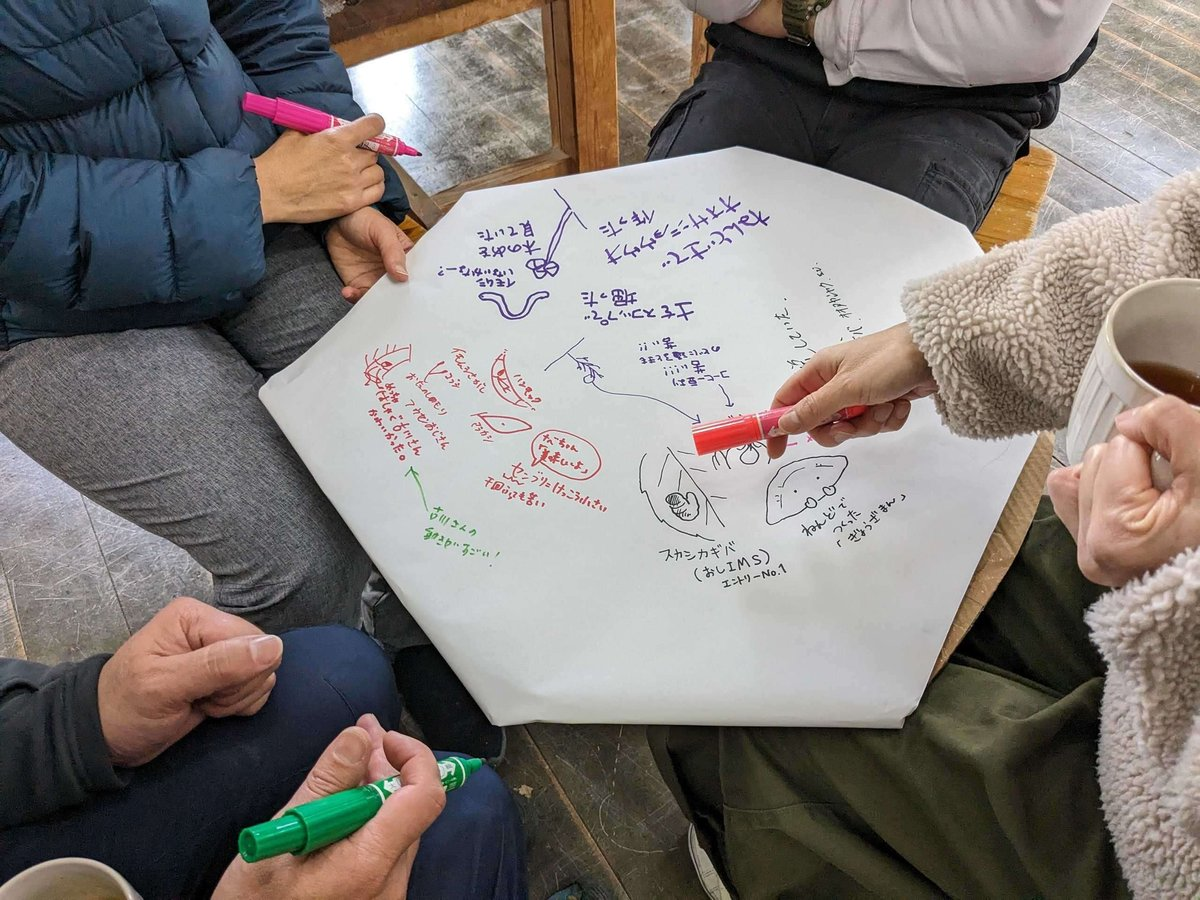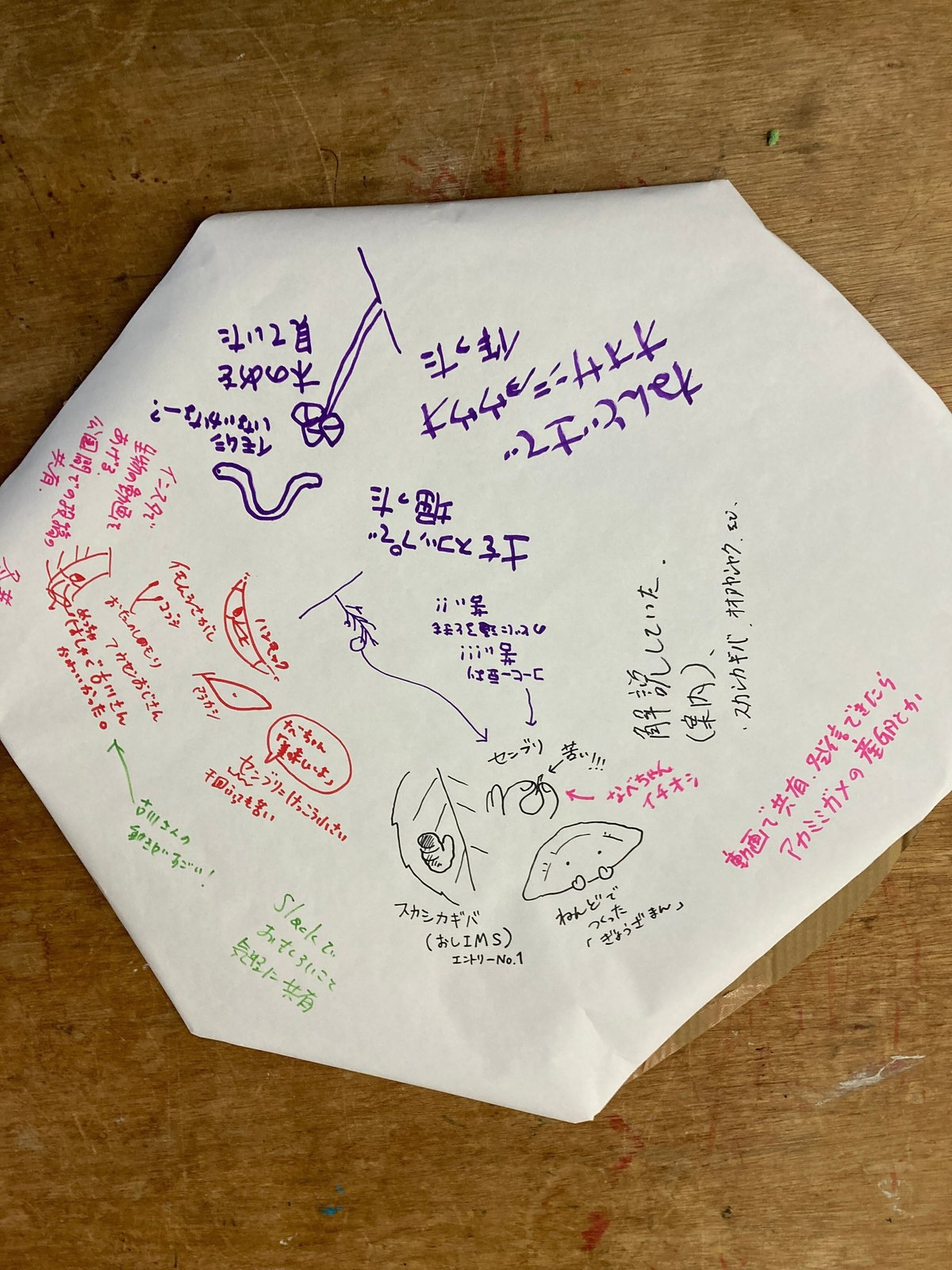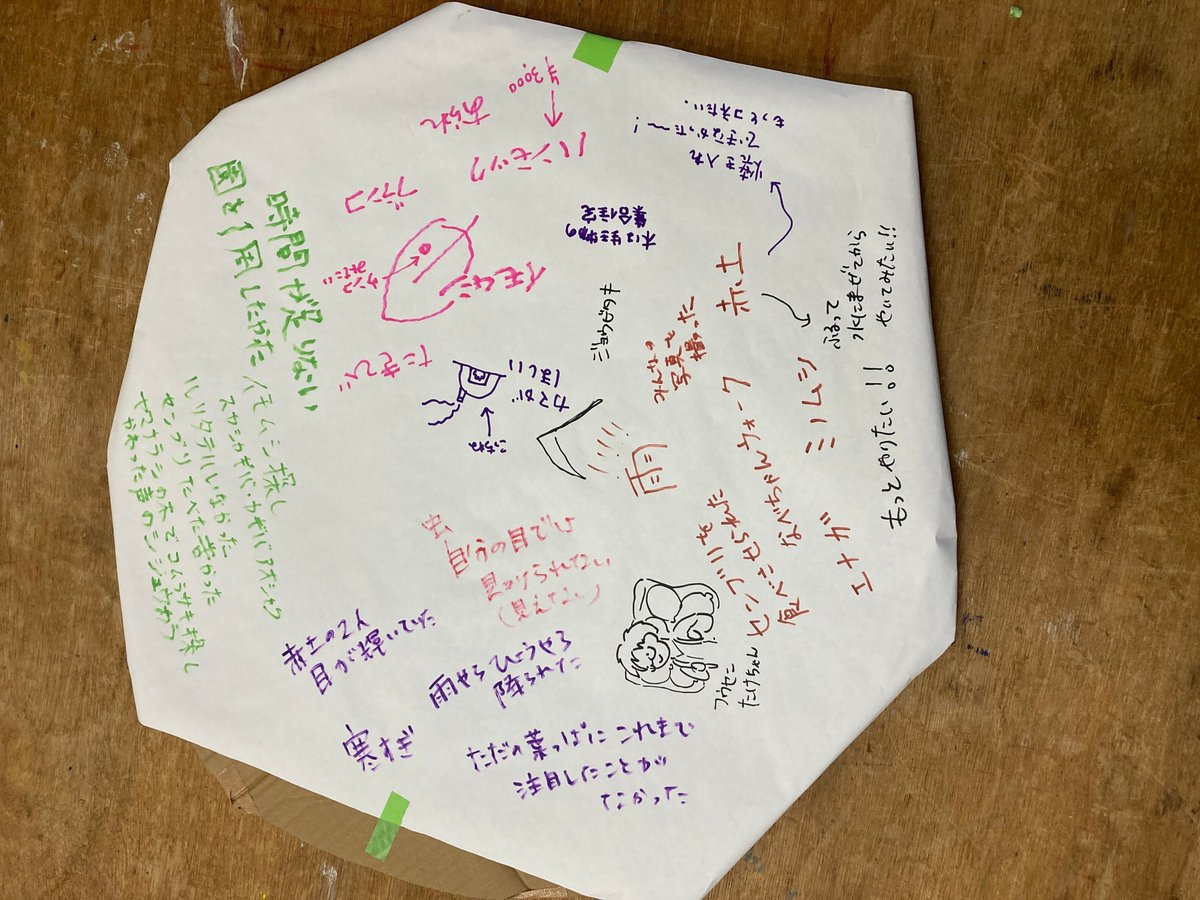 こうした振り返りやワークショップに使える「えんたくん」という商品が販売されていますが、今回はその簡易版。段ボールで作った板の上に模造紙を敷き、みんなで足で支えながら振り返りの内容を書きます。何回かテーブルを回りながらどんどん書いていきます。