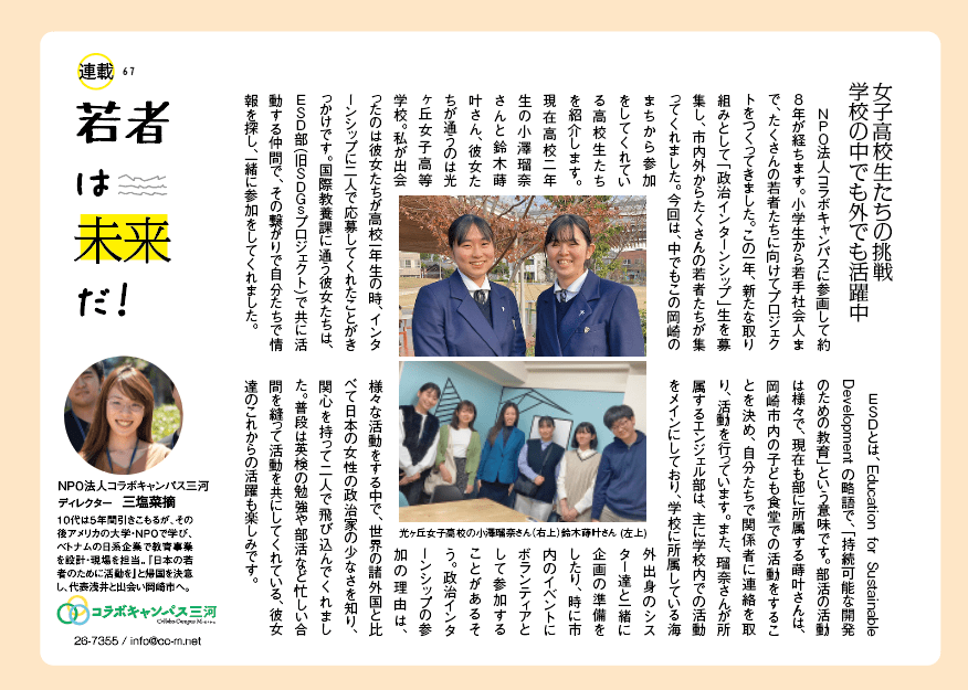 NPO法人コラボキャンパスに参画して約8年が経ちます。小学生から若手社会人まで、たくさんの若者たちに向けてプロジェクトをつくってきました。この一年、新たな取り組みとして「政治インターンシップ」生を募集し、市内外からたくさんの若者たちが集ってくれました。今回は、中でもこの岡崎のまちから参加をしてくれている高校生たちを紹介します。現在高校二年生の小澤瑠奈さんと鈴木蒔叶さん、彼女たちが通うのは光ヶ丘女子高等学校。私が出会ったのは彼女たちが高校一年生の時、インターンシップに二人で応募してくれたことがきっかけです。国際教養科に通う彼女たちは、ESD部(旧SDGsプロジェクト)で共に活動する仲間で、その繋がりで自分たちで情報を探し、一緒に参加をしてくれました。 ESDとは、Education for Sustainable Development の略語で、「持続可能な開発のための教育」という意味です。部活の活動は様々で、現在も部に所属する蒔叶さんは、岡崎市内の子ども食堂での活動をすることを決め、自分たちで関係者に連絡を取り、活動を行っています。また、瑠奈さんが所属するエンジェル部は、主に学校内での活動をメインにしており、学校に所属している海外出身のシスター達と一緒に企画の準備をしたり、時に市内のイベントにボランティアとして参加することがあるそう。政治インターンシップの参加の理由は、様々な活動をする中で、世界の諸外国と比べて日本の女性の政治家の少なさを知り、関心を持って二人で飛び込んでくれました。普段は英検の勉強や部活など忙しい合間を縫って活動を共にしてくれている、彼女達のこれからの活躍も楽しみです。