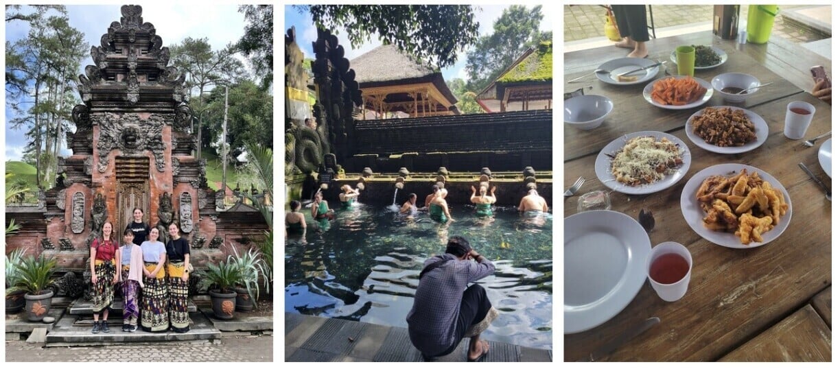 最初の1週間は文化体験ウィークでした 。伝統的な絵付けや料理に挑戦し、地元の方々と一緒にウォーターテンプルを訪れました。手作りの「花飾り」をお供えし、共に祈りを捧げる時間は、バリの文化の深さを肌で感じる貴重な経験でした。ウブドの街に出かけ、モンキーフォレストに行ったり、インドネシア語のレッスンを受けたりと、観光とは違う「生活」としてのバリを満喫しました。