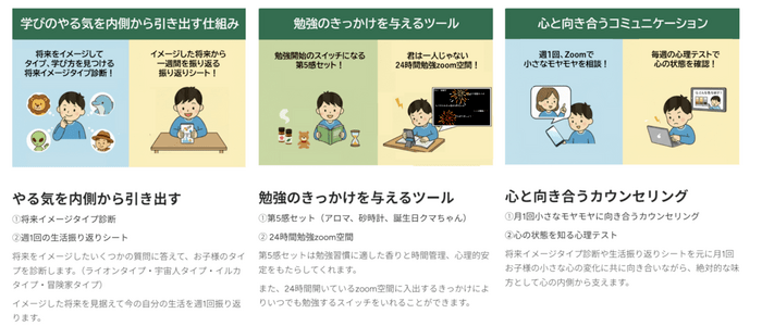 勉強タイムとは、第5感を育むツールを駆使して、心のモヤモヤをなくしながら、子供たちの内からのやる気を引き出し、勉強習慣を身に着ける24時間モチベーションマネジメントオンライン塾です。