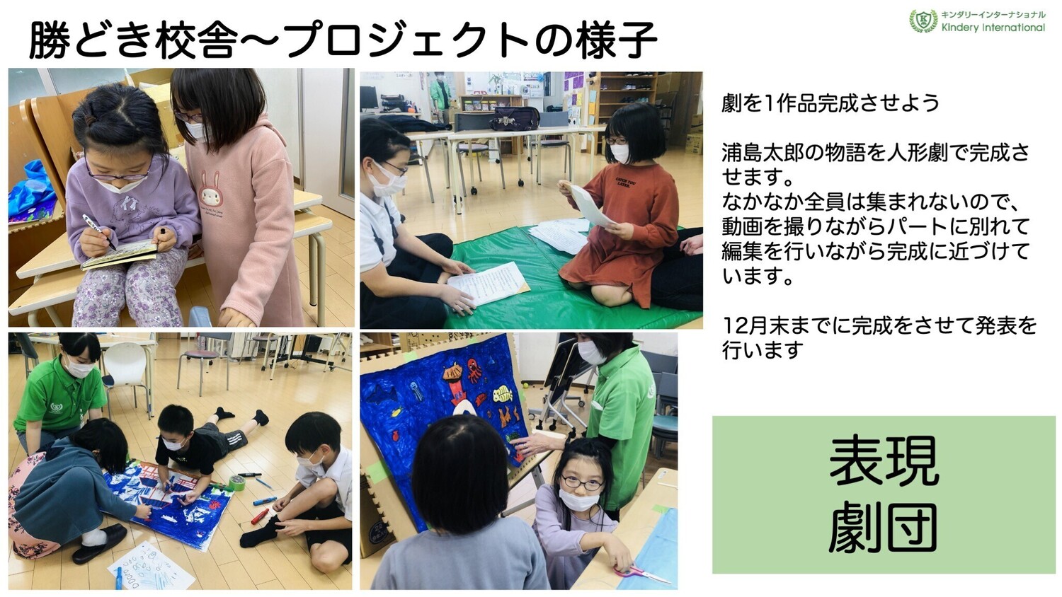 オリジナル劇をいち作品完成させよう。浦島太郎の物語を人形劇で完成させます。なかなか全員は集まれないので、動画を撮りながらパートに別れて編集を行いながら完成に近づけています。12月末までに完成をさせて発表を行います!