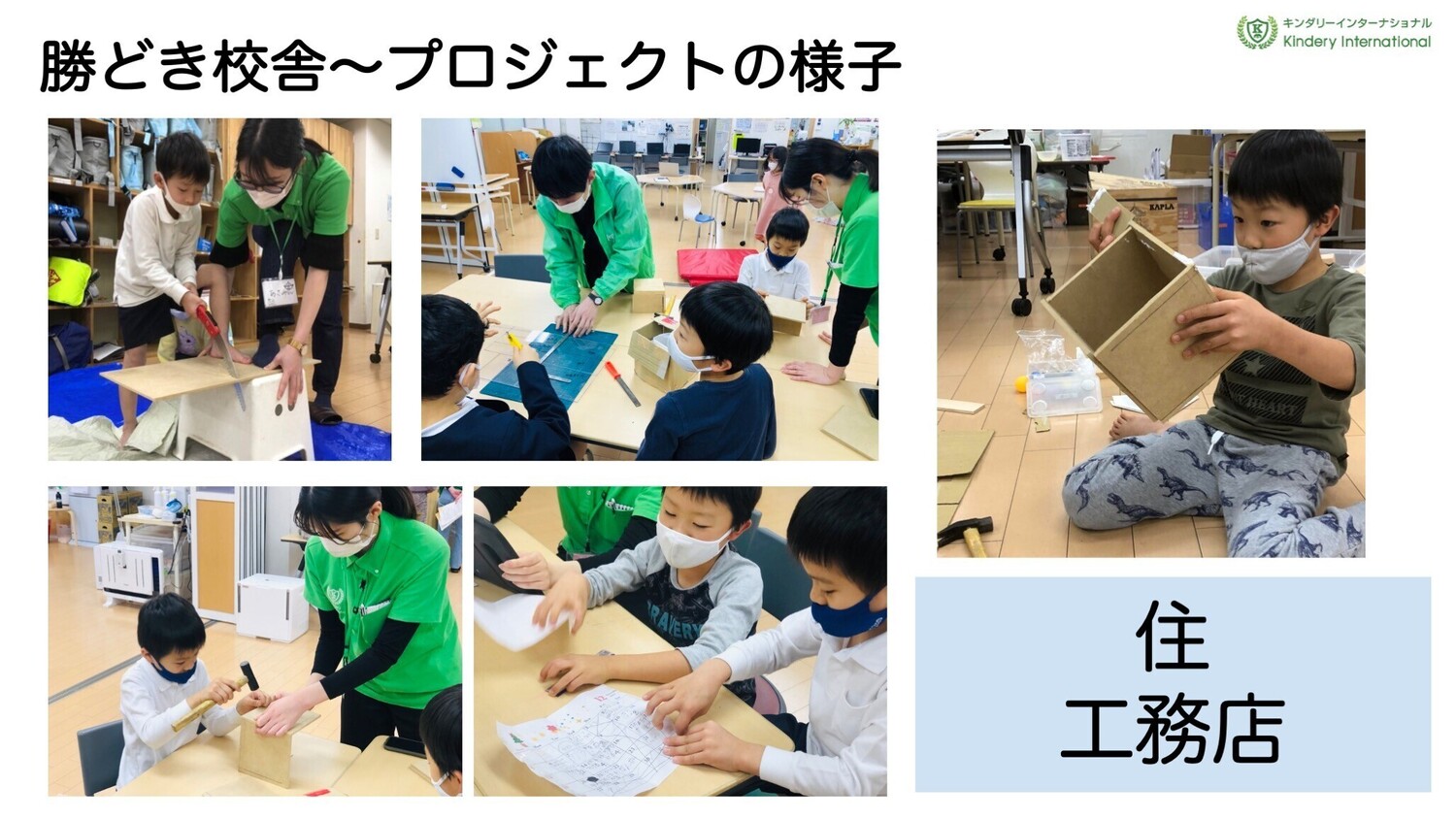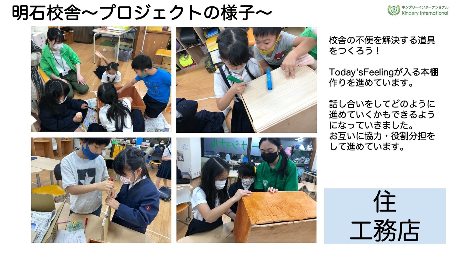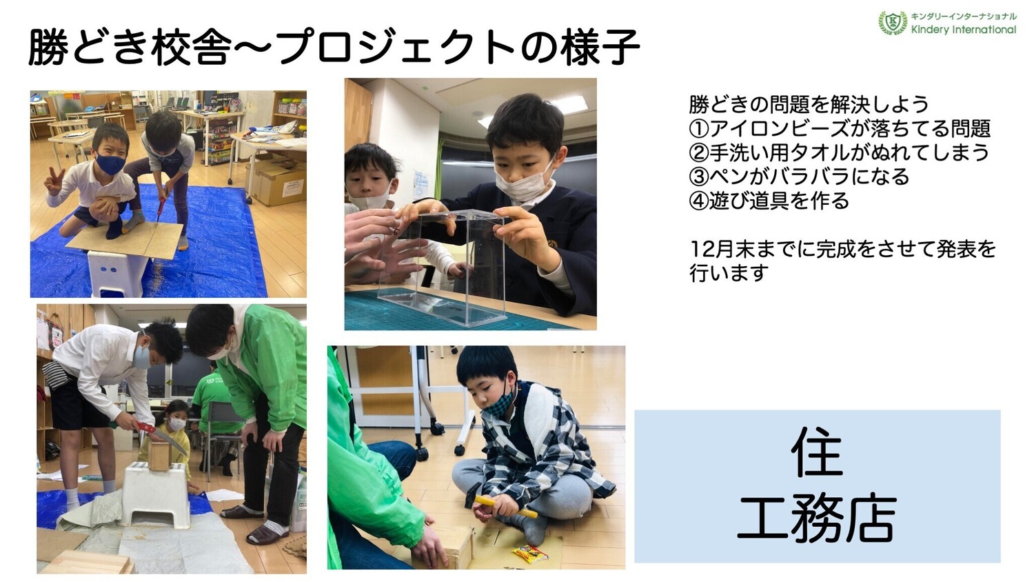 工務店プロジェクト「各校舎の不便」を観察したり、お友達にヒアリングをしながら子供たち自ら課題を設定していきます。その課題を解決するために一人ひとりが作りながら解決策を生み出していく課題解決型プロジェクト。
