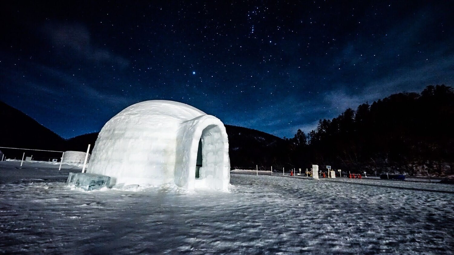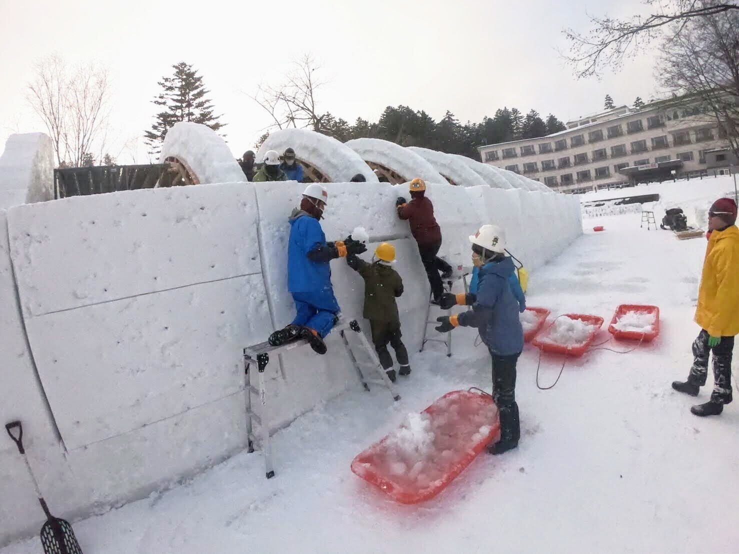 コンテナに、集めた雪に水をかけてシャーベット状にした雪を押し詰めて、ひたすらアイスブロックを作りました。かなりの体力を使う仕事で、-15℃の気温のはずなのに汗でびちゃびちゃになるくらいでした。
