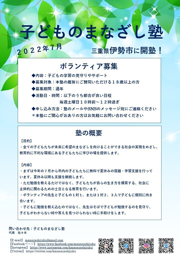 子どものまなざし塾では以下の塾のメールアドレスや塾のInstagram、FacebookページやTwitterからもご応募やお問い合わせを受け付けています。
