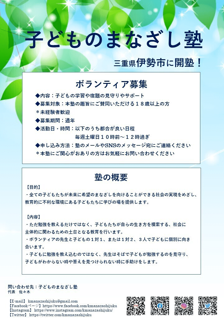 子どものまなざし塾では以下の塾のメールアドレスや塾のInstagram、FacebookページやTwitterからもご応募やお問い合わせを受け付けています。