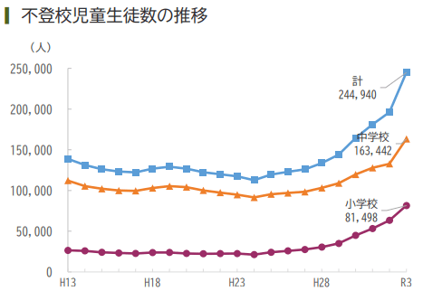 文部科学省は、令和4年10月27日に公表された「令和3年度児童生徒の問題行動・不登校等生徒指導上の諸課題に関する調査結果」によると、不登校児童生徒数は9年連続で増加し、最多となった。小・中学校における長期欠席者のうち、不登校児童生徒数は244,940人(前年度196,127人)、児童生徒1,000人当たりの不登校児童生徒数は25.7人(前年度20.5人)である。