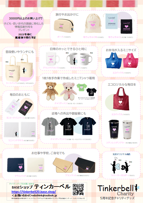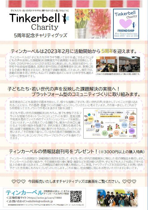 ティンカーベル団体設立・活動開始5周年を記念して、子ども・若い世代の課題解決に特化した初の情報誌を発行、BASEショップにて、ティンカーベルの5周年記念チャリティグッズを総計3,000円お手に取ってくださった方に購入特典としてプレゼントいたします。