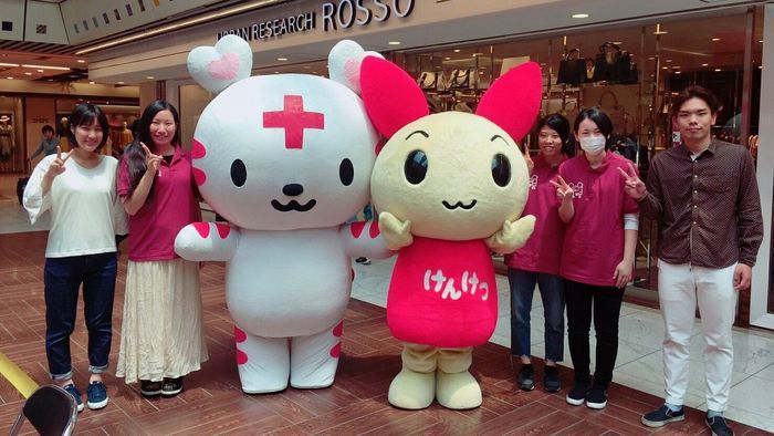 (写真:赤十字京都ユースメンバーと ハートラちゃん&けんけつちゃん)