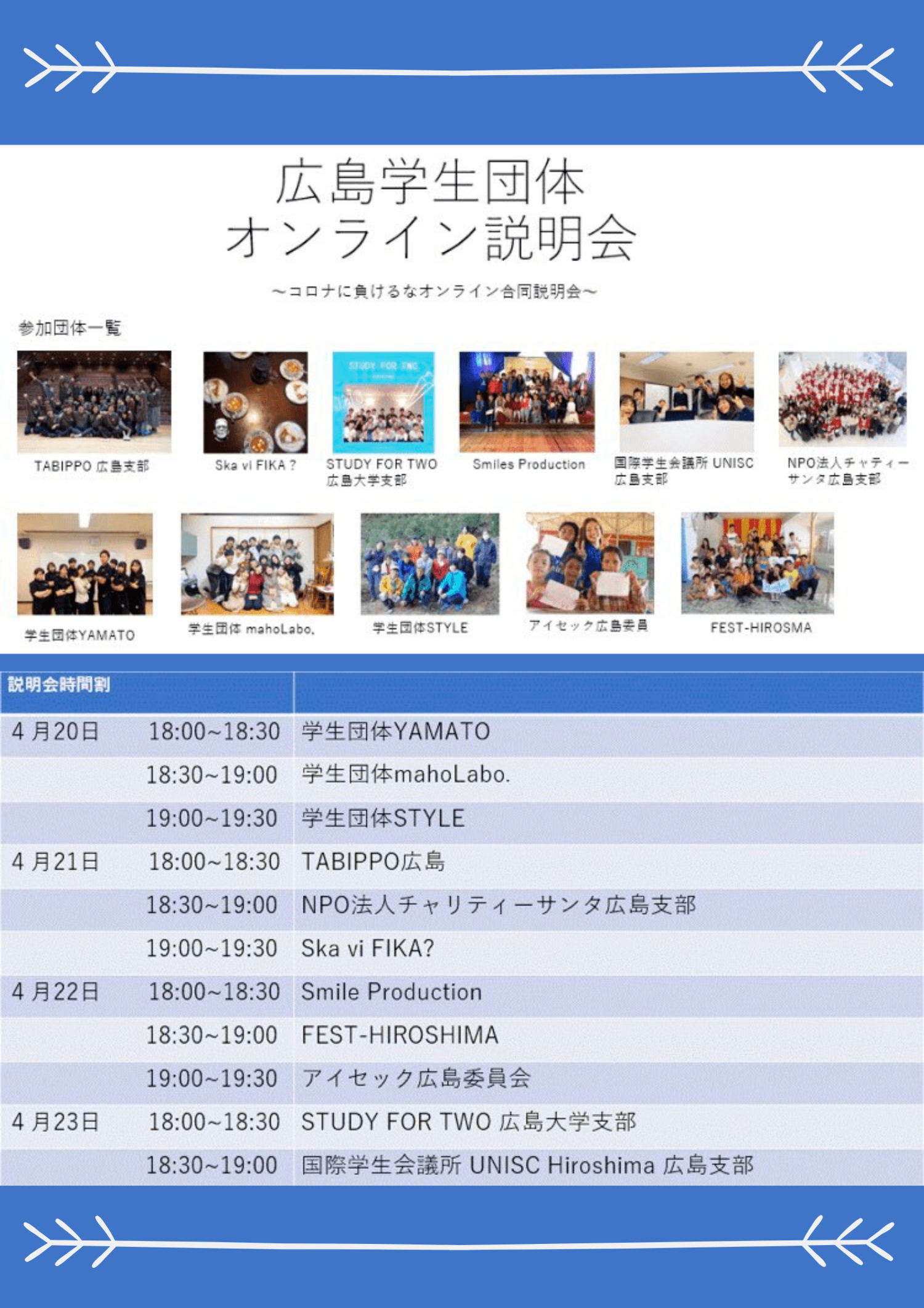 「若い力で広島を盛り上げる」をモットーに、広島の地域に魅力を発信。地域活性化を目的とした「ジャンルにとらわれない」活動を企画し、活動します。