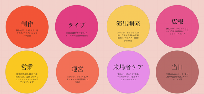 ・制作:フェスのコンテンツを企画して、予算管理やスケジュールの管理をします