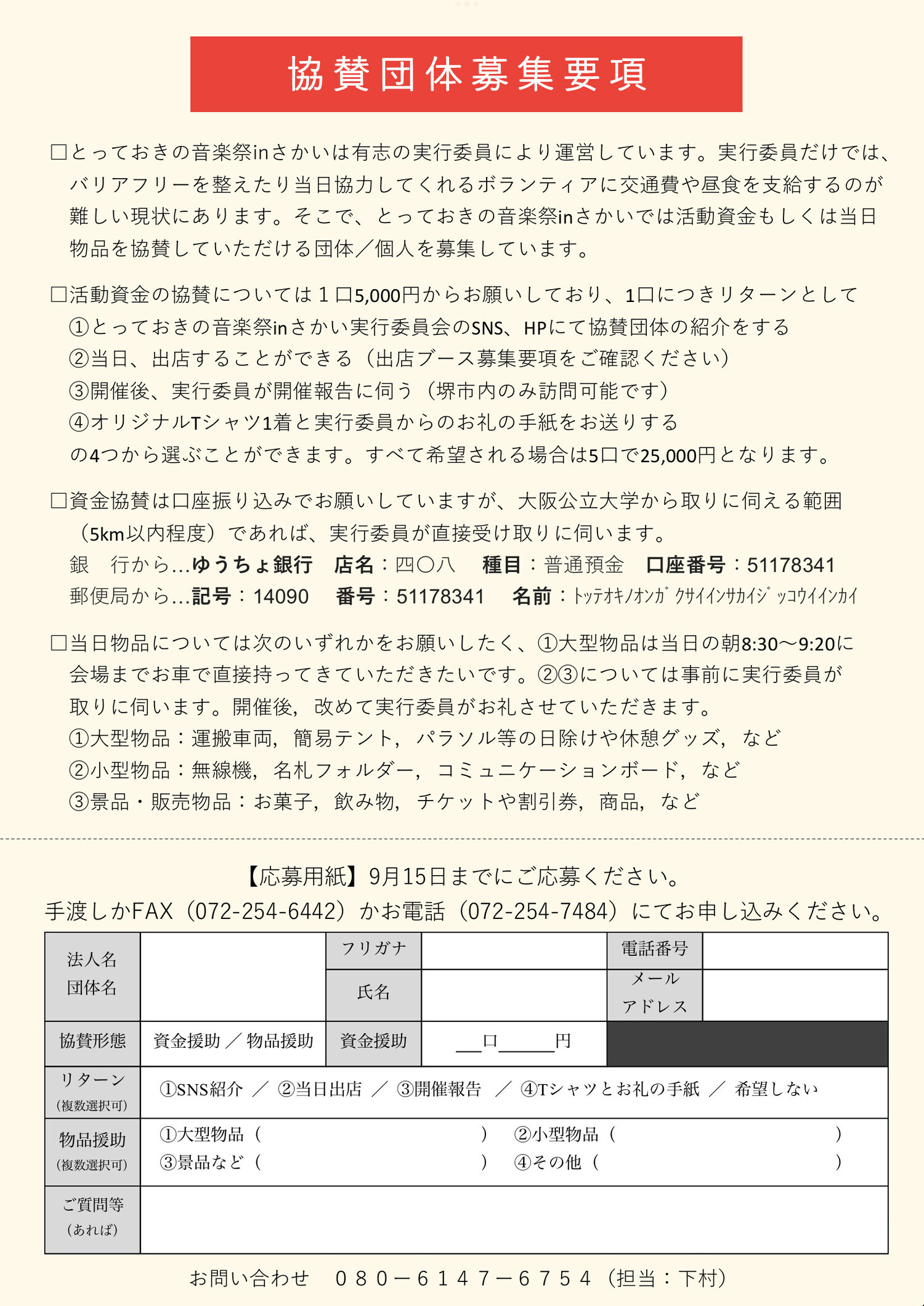 とっておきの音楽祭inさかい実行委員会は有志で行っているためバリアフリーやボランティアさんへの活動資金が足りていません。そのため、寄付や物品の提供でご協賛いただける方を募集しています。詳しくは画像をご覧ください。
