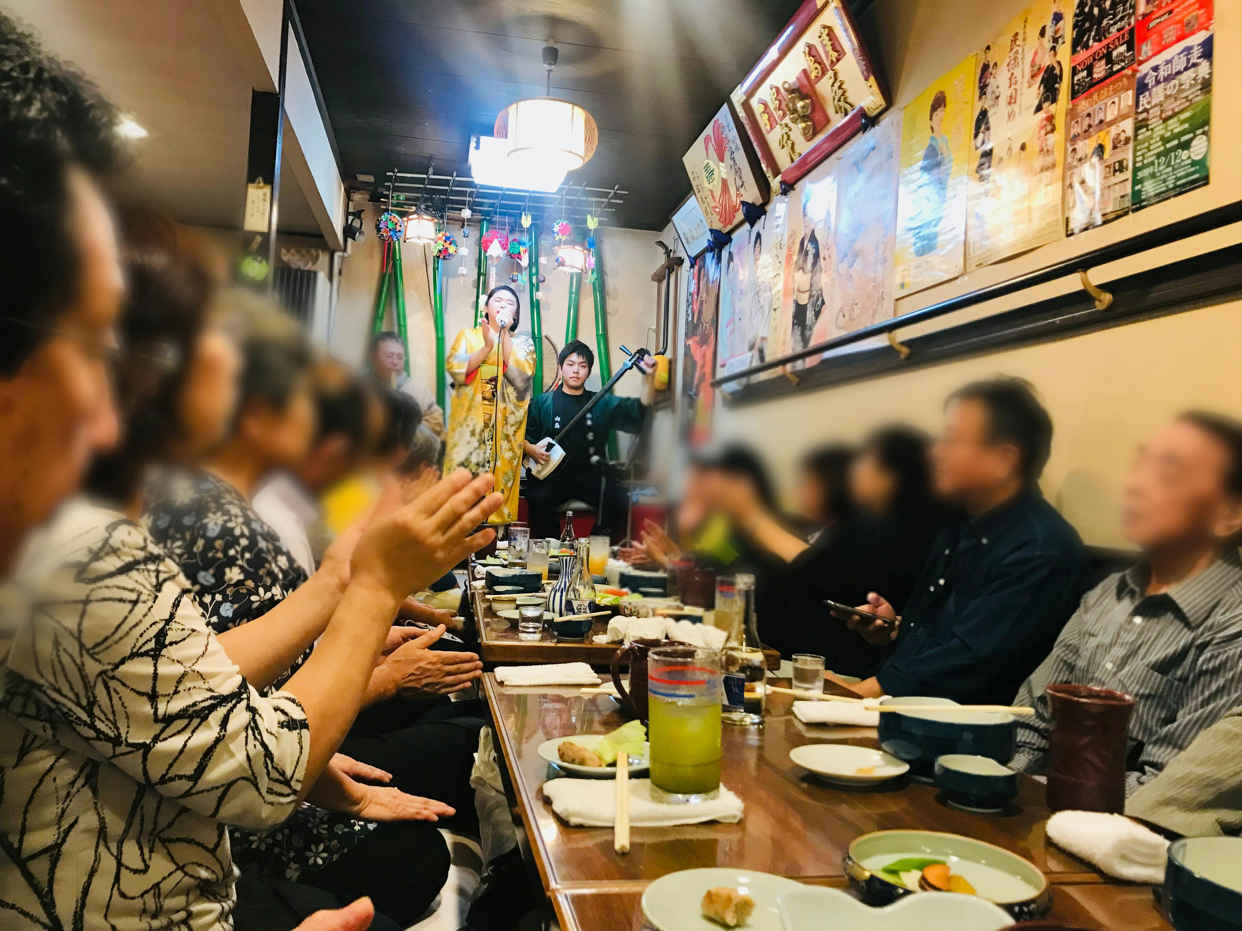 民謡酒場とは、日本民謡を生演奏で楽しめる飲食店です。集団就職の時代であった昭和30年代に、故郷を懐かしむスポットとして、上野界隈に100件以上あったと言われています。 昔は、同郷同士が仕事の疲れを癒すため、郷土の唄、民謡を唄って英気を養っていました。当時は民謡ブームともいわれており、大変賑わっていたと言います。