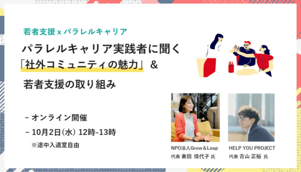 パラレルキャリアとして活躍される2名のゲストをお招きし、これまでのキャリアや若者支援の取り組み、パラレルキャリアとして社外コミュニティに属して感じるメリットなどについて講演。