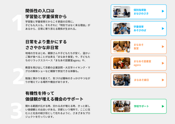 京都 西院で横並びの古民家軒をリノベーションして、学習塾・学童保育を通して家庭と地域に寄り添い、京都をフィールドに、社会とつながる環境をつくっています。