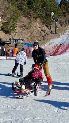 ハンディスキー初心者の方にバイスキーをご紹介した後、バイスキーの後ろについて車椅子を押すかのようについて介助します。スキー以外にもその他の活動のサポートも行っています。交流活動としてオフシーズンにはBBQやキャンプを実施し、交流を深めています。
