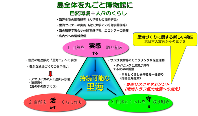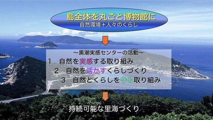 NPO法人黒潮実感センターは高知県南西部に位置する大月町柏島を、海のフィールド・ミュージアム「島がまるごと博物館(ミュージア)」と捉え、環境教育(里海教育)、環境保全、地域の活性化などさまざまな活動を通じて、持続可能な「里海」のモデルをこの地に作る活動を行っています。