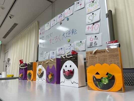 学期末やハロウィン、クリスマスなどに季節ごとの「教室レクイベント」を開催しています。ボランティアが中心となって飾りつけや企画を行い、子ども達と一緒に盛り上がっています。2024年度のクリスマス会では市内の企業からの「クリスマスケーキ」のご寄付があり、レクを楽しみつつ、ケーキを頂きました!写真は2024年度のハロウィンイベント。生徒へのプレゼントとしてボランティアが作ったハロウィン仕様の袋にお菓子を入れて、お渡ししました!