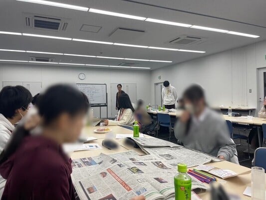 「メディア」などのテーマに関する「プチ講義」が行われてきました。写真は新聞の「全国紙」と「地方紙」における一面記事を見比べてみよう!というプチ講義です。
